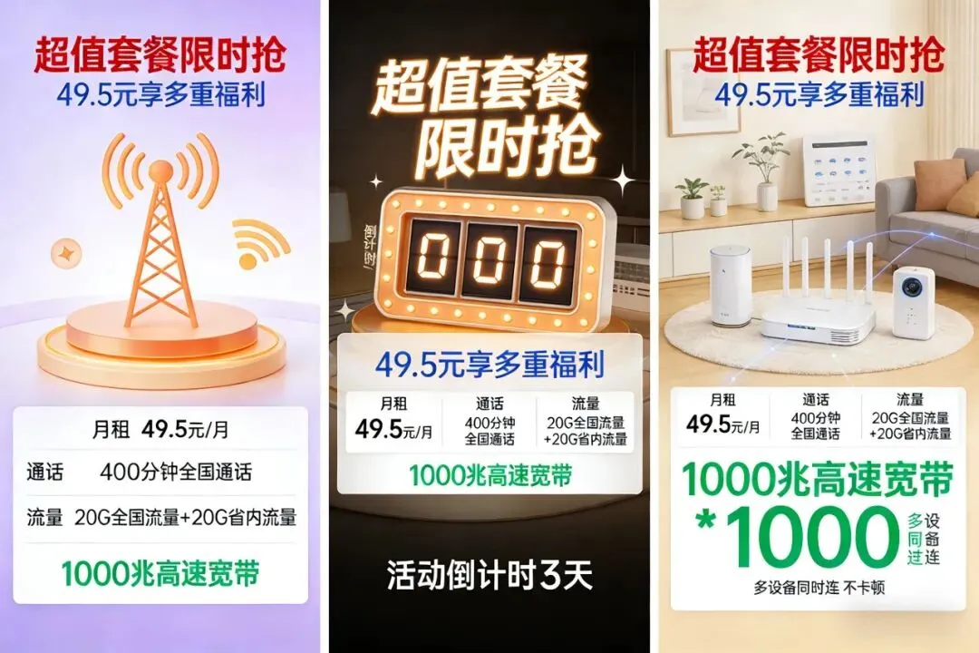 - 千兆宽带免费送:1000兆高速宽带直接打包,追剧不缓冲、游戏低延迟、多设备连接不卡顿,居家上网体验飙升。