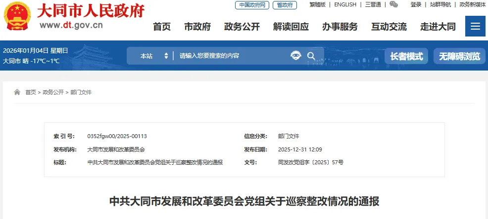 截至2025年12月11日,巡察反馈的3个具体问题,已完成整改3个,整改完成率100%;制定整改措施10项,已全部落实到位,完成率100%;健全完善制度机制2项,规范了市殡葬服务中心、云州区殡仪服务站和公益性公墓的收费标准。