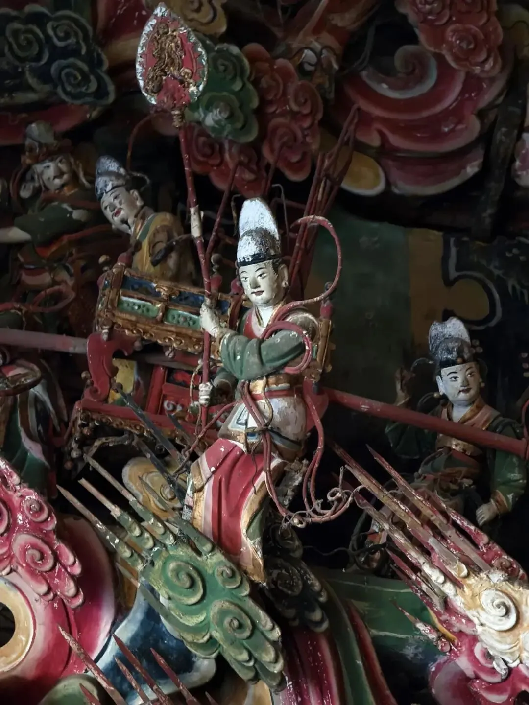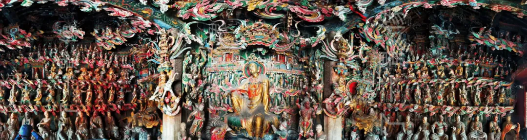 走进观音堂,仿佛置身于一个色彩斑斓的艺术世界。殿内的三面墙壁及屋顶梁架之上、门窗顶部,都被描金彩绘的泥胎彩塑、悬塑装点得熠熠生辉。这些塑像或坐或立,或庄严肃穆,或慈祥可亲,每一尊都栩栩如生,仿佛能够穿越时空,与观者进行心灵的对话。