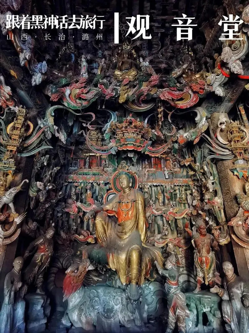 观音堂,坐落在长治市潞州区大辛庄镇梁家庄村,以保存完好的儒释道三教合一的悬塑艺术闻名,被誉为“海内悬塑之冠”,近年因游戏《黑神话悟空》取景而成为热门旅游地。