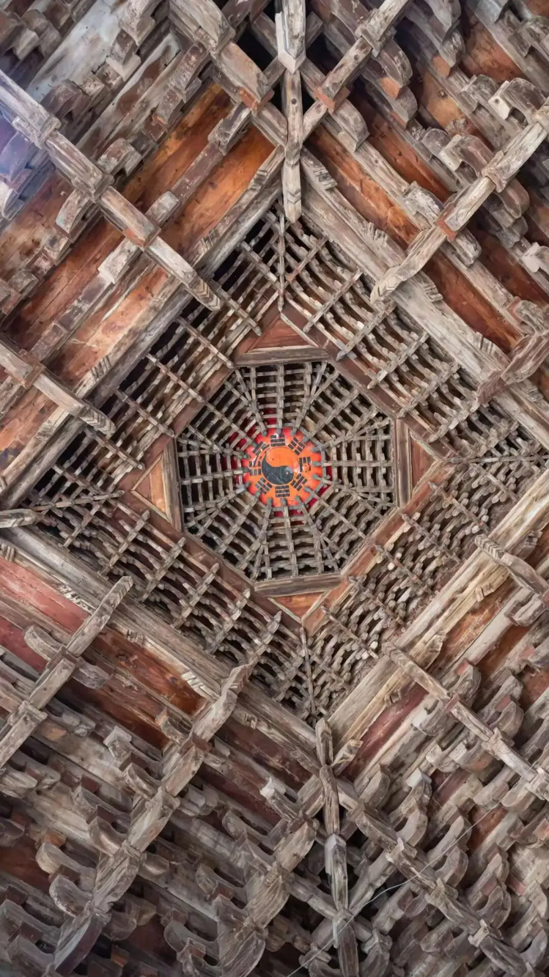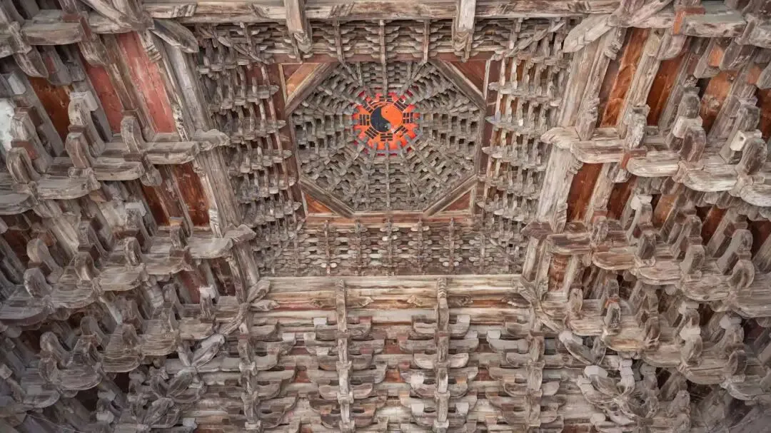 清徐尧庙 建于明正统年间,呈方形布局,顶部由木构藻井筑砌,无梁无架,也称无梁殿。顶部重叠五层,形成庞大的木构斗拱式藻井,既可以将上层的梁架隐蔽起来,又可以作为神像地宝盖,设计十分巧妙,极富装饰趣味。圣母庙东山墙上绘有圣母驾凤出行图和归来图壁画,惟妙惟肖,栩栩如生。