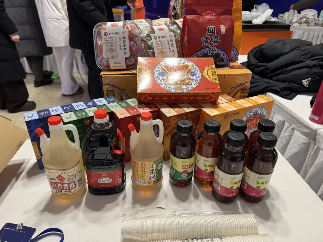 本次选品会上,闻喜乡村e镇精心打造的特色展区,集中展示了闻喜煮饼、山楂系列、小米香醋、山楂酒、卫嫂花馍等多款地标产品与非遗好物。拥有三百年历史的闻喜煮饼,以“酥、软、甜、香”的经典口感吸引大批采购商与市民驻足试吃;由山楂加工而成的山楂糕、山楂醋,凭借天然酸甜的风味成为健康食品与饮品的热门之选;传承古法工艺的小米香醋,则以醇厚香气彰显晋南调味的独特魅力。多款产品组合展示,全方位呈现了闻喜农产品的优良品质与鲜明特色。