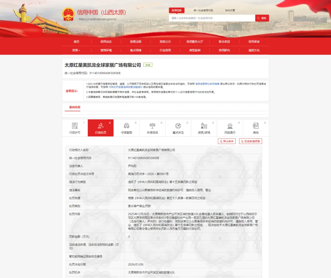 太原南中环红星美凯龙因未经消防救援机构许可,擅自投入使用、营业被罚款3万元...