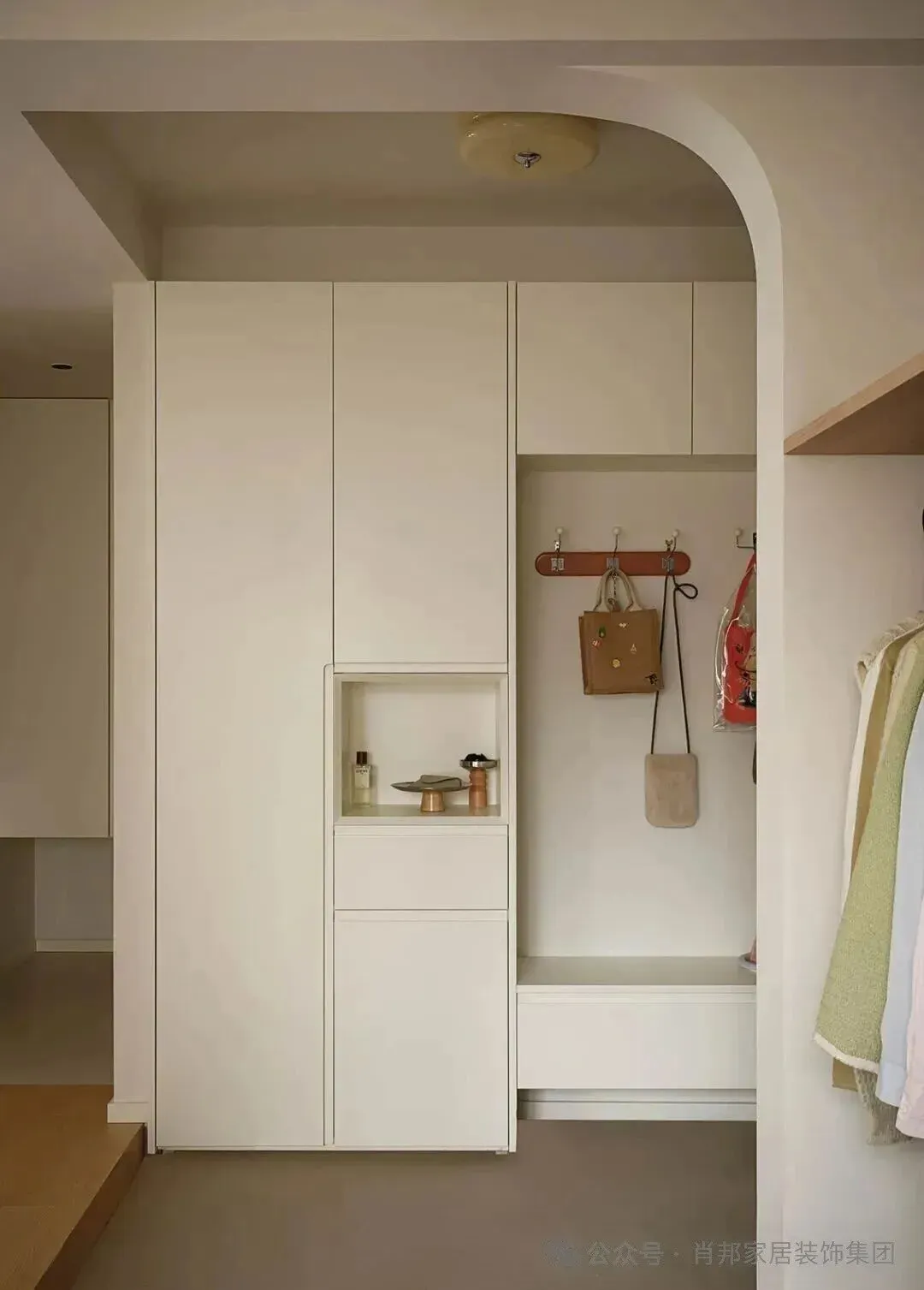 谁说公寓不能做下沉式玄关?利用地暖抬高的3公分,再打掉原有地坪,最终做出了12公分的高低差。搭配一体式鞋柜+换鞋凳,进门随手挂衣放包,轻松实现无尘入户。