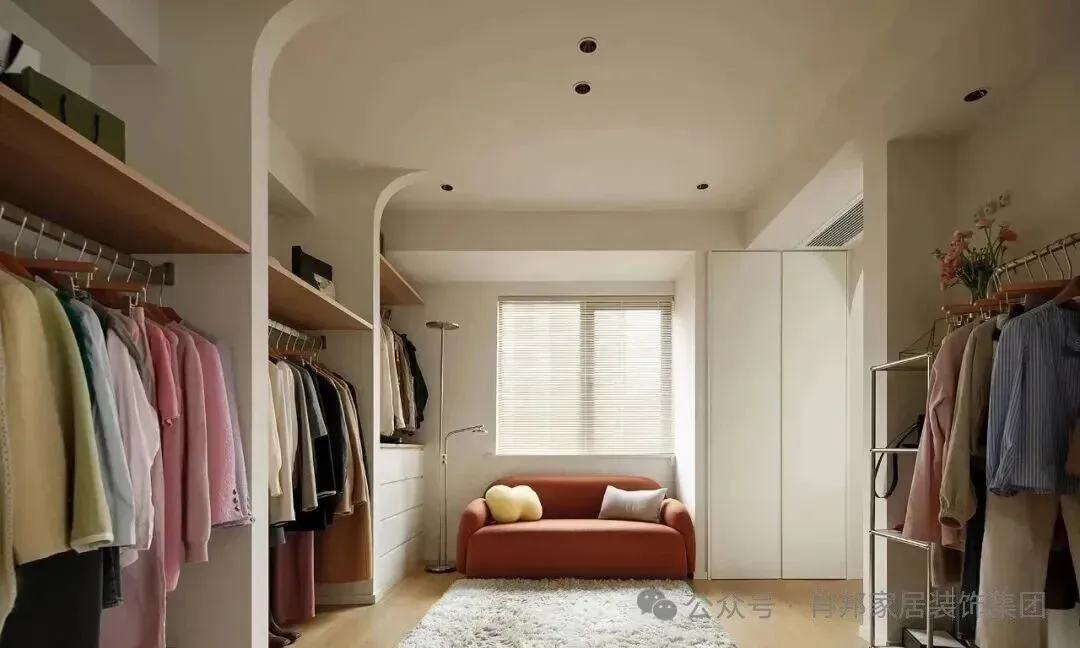 中心区:靠窗布置沙发,两侧分别是带门衣柜和开放式挂衣区