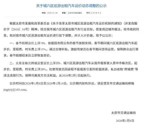 1月8日,太原市交通运输局发布公示,2026年春节假期拟对城六区巡游出租车实施节日运价动态调整。与此同时,结合太原市交通运输局在以往春运期间的工作安排,各大网约车平台也预计将采取增设服务费等措施,以激励司机出车、保障运力。