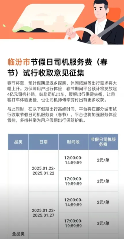 ▲2025年临汾市网约车平台司机春节服务费收费标准