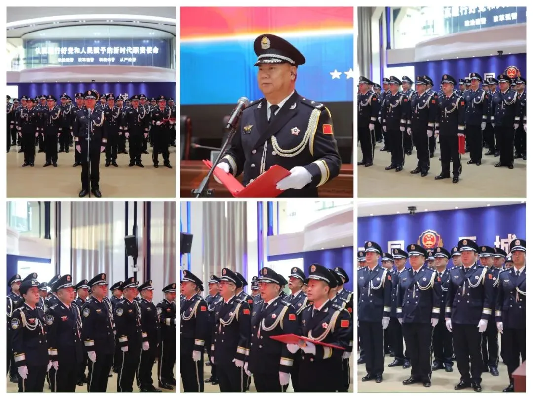 揭牌仪式后,各所、队室负责人在北二楼会议室整齐列队,面向鲜艳的中国人民警察警旗庄严宣誓。铿锵誓言响彻全场,凝聚起“对党忠诚、服务人民、执法公正、纪律严明”的坚定信念。随后,市公安局副局长、平城区副区长、分局党委书记、局长姜宝举同志作宣誓仪式上的致辞,姜宝举同志在致辞中回顾了过去一年全局在维护稳定、打击犯罪、服务群众等方面取得的丰硕成果,向全体民辅警致以节日问候,勉励大家以公安工作现代化建设为契机,持续筑牢安全防线、增进民生福祉。之后全体人员齐声奏唱《中国人民警察警歌》,激昂旋律传递着平城公安守护平安的决心与斗志。