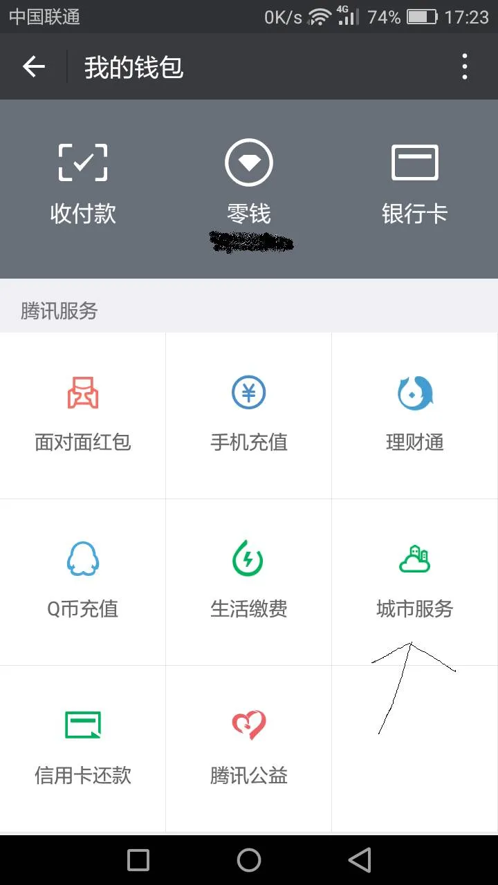第二步,在我的钱包页面点城市服务,系统会自动定位到长治。