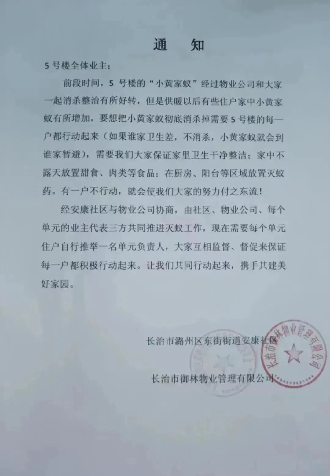 针对业主们反映的情况,记者首先联系到了市农业农村局的相关技术人员进行了咨询,技术人员称,发现大量蚂蚁,一般可以选择大面积喷洒高浓度农药的方法进行灭蚁,但是由于是居民区出现此类情况,大面积喷洒农药是不可取的。针对此种情况,技术人员建议可以采取居民家庭灭蚁用药与物业在楼道及楼体外部喷洒农药相结合的方法进行处理,但是需要整栋楼所有住户参与其中,而且每天都要对屋内的墙缝、门缝、下水道等进行喷洒,且家中不能露天放置甜食、肉类等食品,物业在外部喷洒农药至少也需要五天进行一次。经过专业咨询后,记者联系到了御林家园物业管理中心,沟通了解后得知,物业一直在积极参与灭蚁行动,并在业主刚发现蚂蚁时,便联系了相关技术人员进行了处理,还给业主们发放了灭蚁药品,此后,蚂蚁涌入家中的情况得到了缓解。近期家中通暖后,蚂蚁又出现了。物业工作人员表示,愿意配合安康社区及业主们积极参与到灭蚁行动中,并会将5号楼周围的卫生环境进行进一步优化。当天下午,物业管理中心的工作人员便在5号楼每个单元楼下张贴了全员共同参与灭蚁行动的通知,提醒每一户业主要每天坚持用药,目前还未发现家中有蚂蚁的业主也要积极参与到活动中,灭蚁行动需要所有人的参与,不然就会发生蚂蚁清理不到位的情况,也会发生蚂蚁涌入不用药业主家中的情况。物业管理中心工作人员表示将会逐户进行电话提醒,针对不常居住的业主也会进行及时通知,社区网格员也会在微信群中及时提醒,确保此次灭蚁行动的成功实施。生活有难题、工作不顺心、政策不清楚、感情遇波折……生活里,当您遇到各种各样的难题,请与长治日报全媒体记者联系,我们将尽力为您办实事、做好事、解难题。另外,奇闻趣事、突发事件、大事小情,您所关注的新闻事件、民生热点、衣食住行等,也都可以反馈给“帮办”。如果您有想爆料或需要解决的问题,欢迎拨打帮办热线:15534130909,或发送文字、图片、视频等相关线索到邮箱:sdwbrx1890@163.com。我们会派专线记者与您联系。1.请确保反映内容真实、准确、详细,并提供相关证据说明;