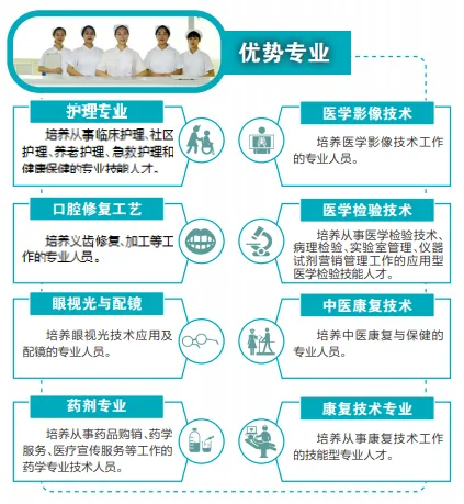 学校有东、南两个校区和一所集教学科研、医疗预防保健于一体的综合性附属医院,现有在校生4000余人,专任教师192人,其中高级讲师86人、硕士研究生48人;省级学科带头人6人,省级专业带头人2人,省骨干教师和教学能手18人。学校开设的护理、口腔修复工艺、眼视光与配镜专业为国家中等职业教育改革发展示范学校重点专业,药剂专业是全国首批职业院校健康服务类示范专业点。学校有2个省级高水平重点建设专业和2个省级高水平重点建设实训基地。