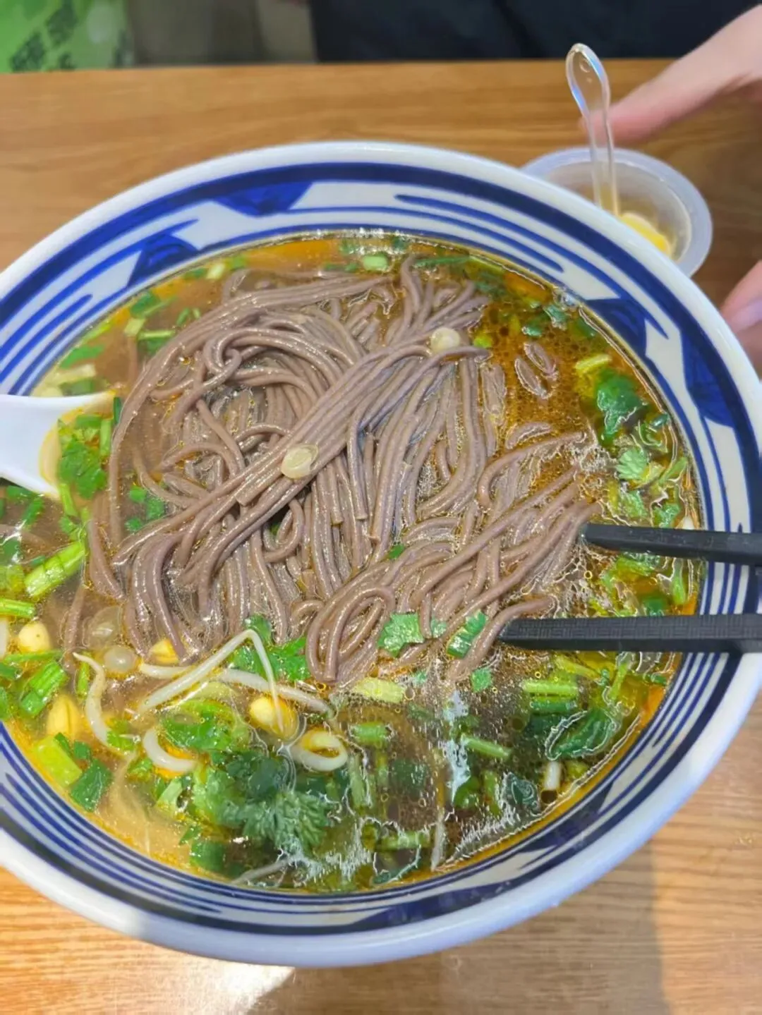 吃饭也有讲究,牛肉丸子面让老板“少汤多菜”,配两瓣生蒜。