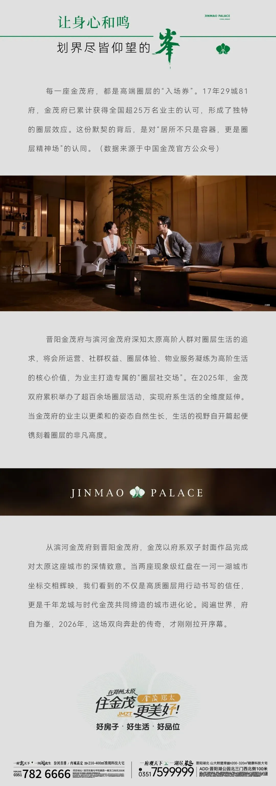 本资料仅为要约邀请,对产品或项目的介绍,旨在提供相关信息,不意味着开发商对此作出任何要约或承诺,买卖双方的权利义务以双方签订的《商品房买卖合同》及其相关协议为准。本资料所示相关内容不排除因政府相关规划、政令及开发商未能控制的原因而发生变化,开发商保留对宣传资料修改的权利。本项目推广名为晋阳金茂府,项目最终备案名称以政府部门核准为准。学校由教育部门统一规划,本项目入学要求以教育部门的相关政策为准,本项目对此不做任何承诺。本资料中户内装修标准及园林景观非实际交付标准及效果,不作为开发商的销售承诺,最终以政府批复为准。本宣传资料所涉及的户型仅供示意参考,其部分装修、家具、陈设等非交付标准,不属于交付范围。不同户型的面积尺寸,功能布局,空间分割、门窗/管井形态位置等均有不同;相同户型因楼栋、楼层、单元等差别,局部结构、面积等也可能不同,具体以政府部门最终审定的图纸和销售合同为准。本资料所发布的内容为2026年1月前的信息,敬请留意最新资料。中国金茂全国客户服务热线:4001-817-817