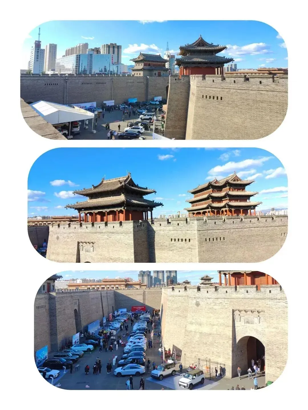 下边的瓮城里正在热闹地举行车展,场面热闹非凡;城外近处护城河蜿蜒环绕,绿树成荫,远处则是高楼林立的城市景象,现代与古老在这里形成了鲜明的对比。微风轻拂,空气清新,让人不禁感叹:从古至今,这里见证了多少变迁与故事!