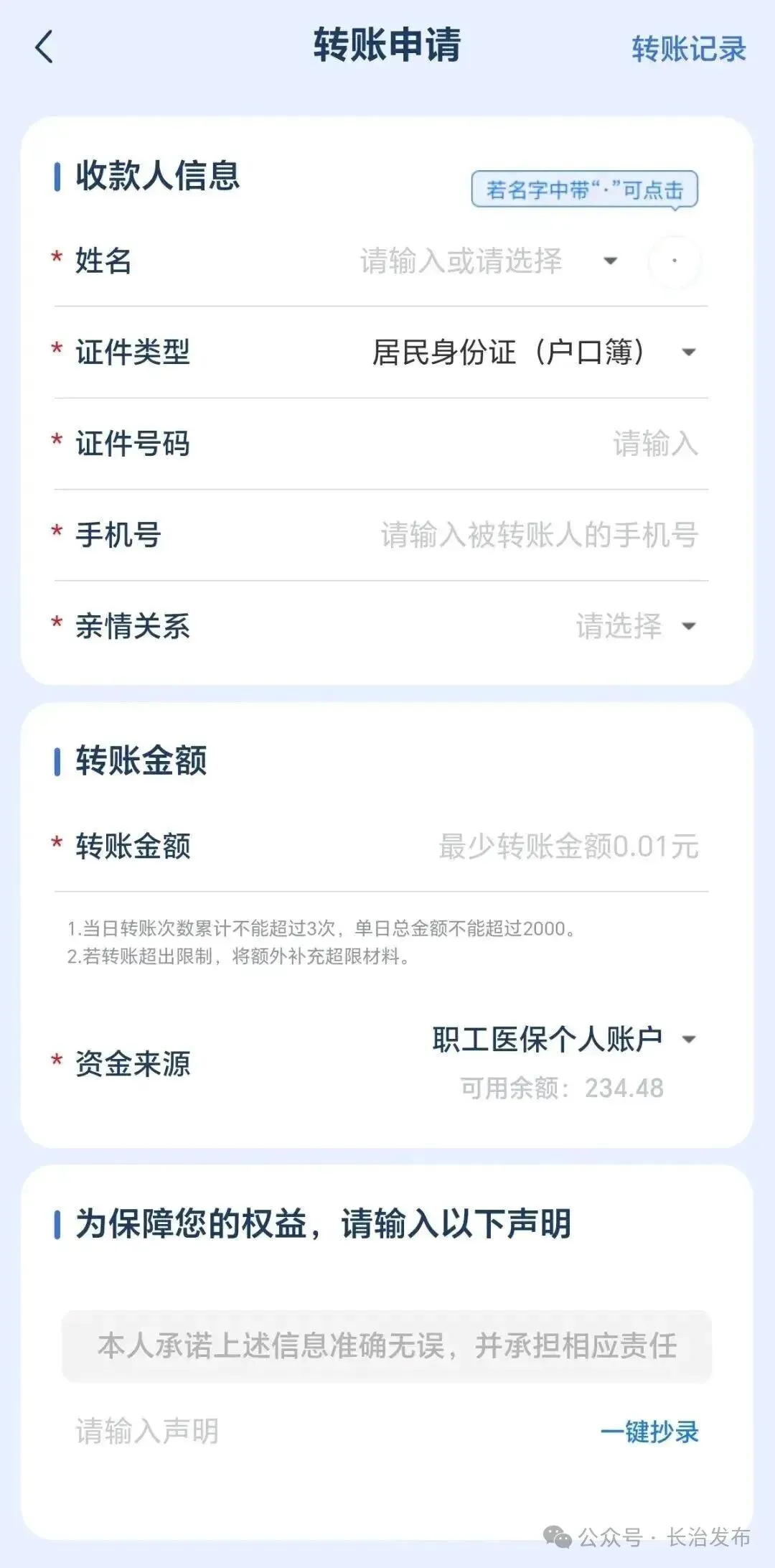 需要提示的是,每个医保钱包账户单日限3笔转账,每笔转账金额不超过2000元。