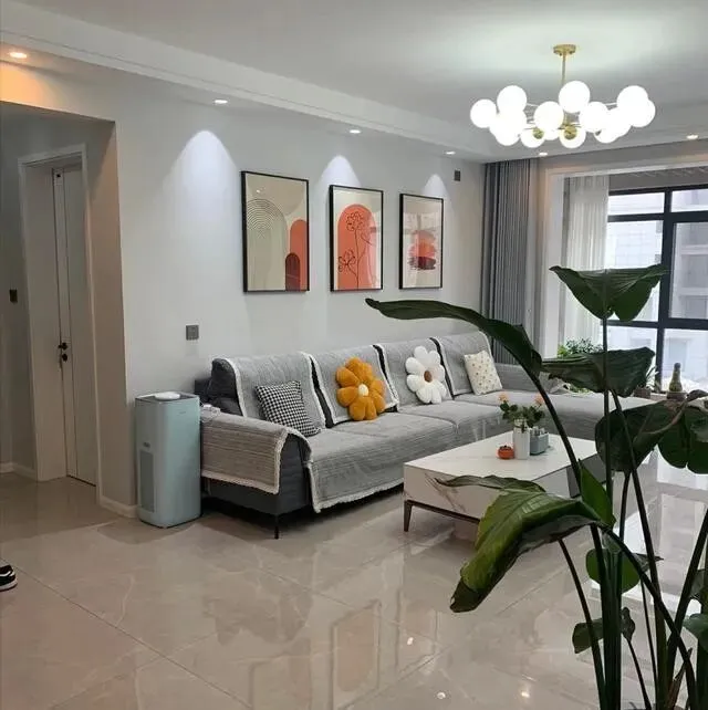 沙发是浅灰色布艺的 , 搭一张木茶几 , 完事了。