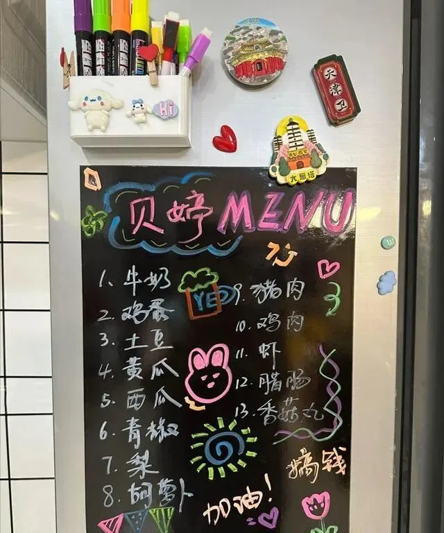 我注意到一个细节 , 冰箱旁边挂了块小黑板 , 写着当天的菜单和购物清单。