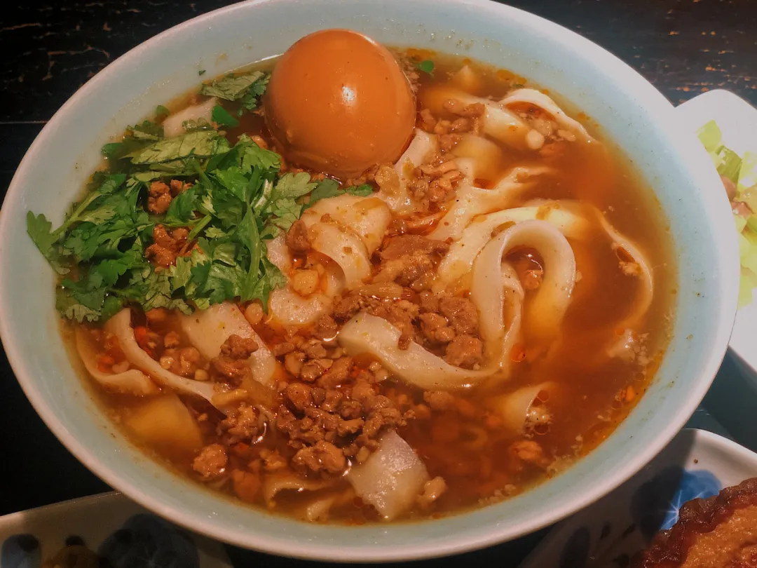 ,被大骨汤和多种调味品和熬成的卤汁汤底浸润,咸香适口。吃面的标配是由圆白菜腌制的一小份烂咸菜,再加上卤蛋、豆腐干和肉丸子,甚至再来一份扒肉条,奢华感倍增。一碗热乎乎的刀削面下肚,感到筋骨舒畅,人生快意,寒风刺骨的天气也不那么面目可憎了。