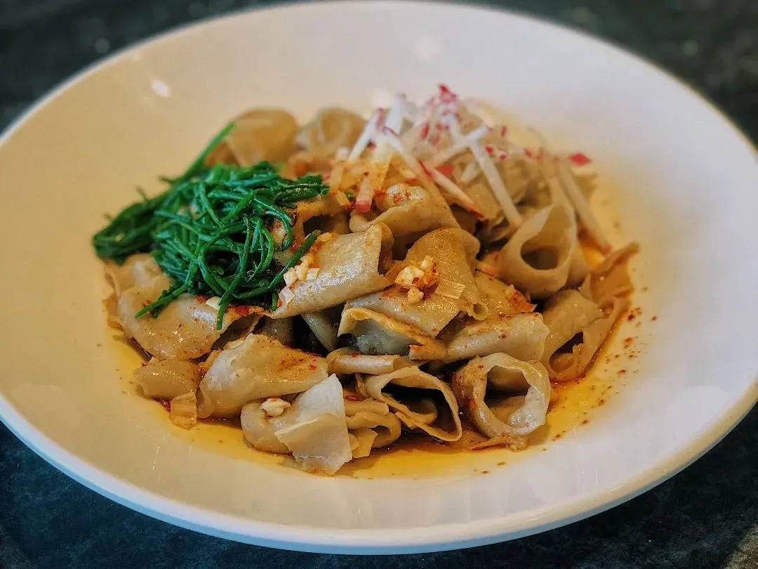 则是用难得一见的绿色蔬菜沙葱,配上油泼的莜面,入味又有嚼劲,酸爽的感觉让它一度成为西贝莜面村的招牌特色。