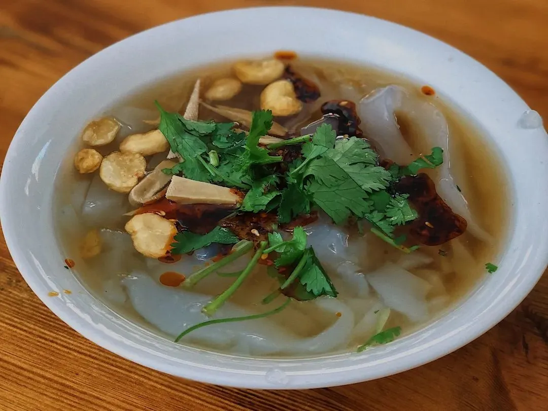 浑源凉粉现做现切,加上醋和辣椒油调制好的汤底,油香中带着一丝冰凉。用碧绿爽脆的黄瓜丝、金黄炸好的酥脆兰花豆作为标配点缀,登临恒山后的疲累,也在这碗酸辣的浑源凉粉中一扫而空。