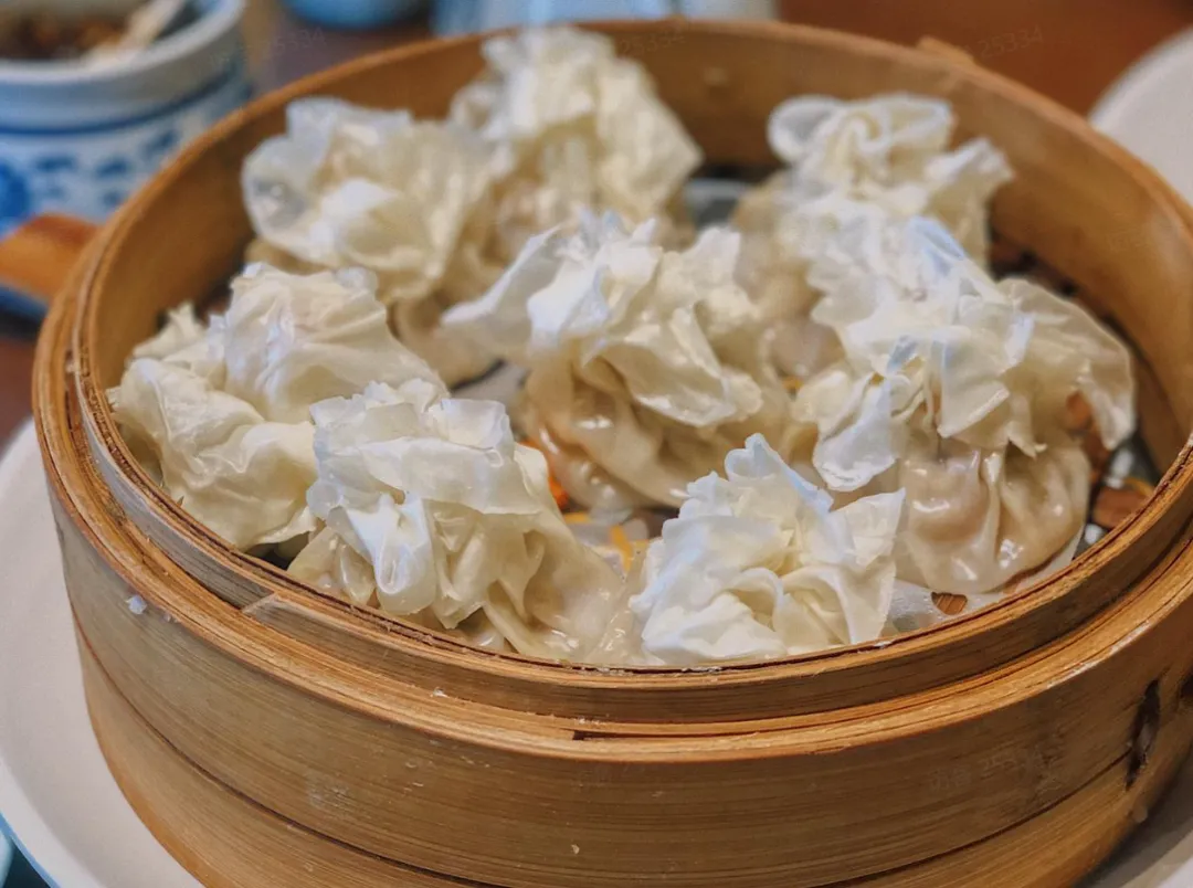 ,羊肉馅儿的烧麦个头饱满,烧麦皮上的褶子薄而透,略带汤汁,一口下去幸福感满满。