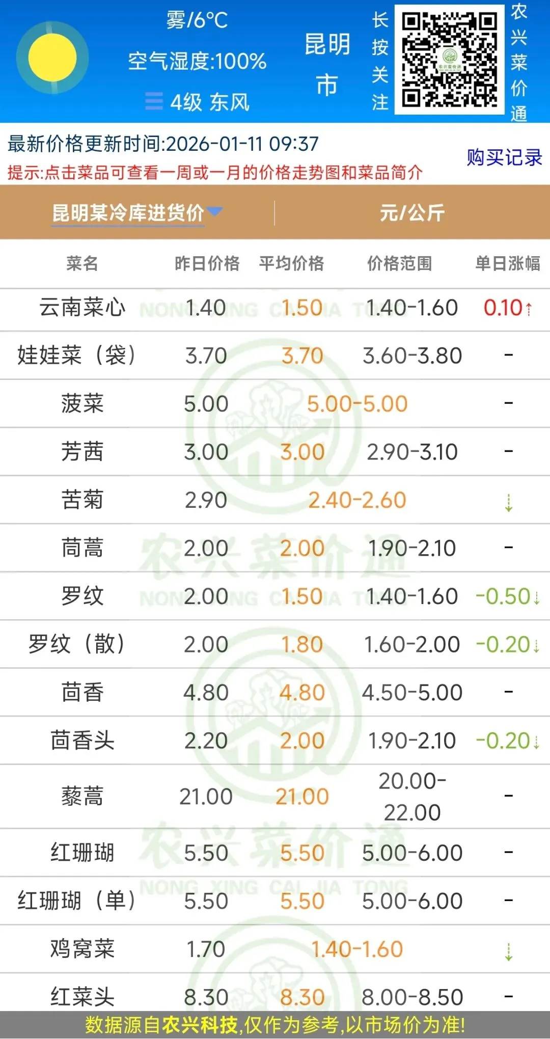 近几日冷空气已经有所缩减,云南大部气温开始回升,但弱冷空气还在徘徊,阴雨及局部高海拔地区的降雪天气还会短时出现。目前冷空气主要影响范围我国偏北方地区,南方地区近期气温仍是较为适宜的,蔬菜的产能正常。产区表现平稳,叶菜全员观望。小菜处境依旧不太乐观,罗纹、茴香几个一周近乎腰斩;手指萝卜短时供需影响,今日快速反弹。韭黄暂归正常波动,单天供需及分货情况会适当调节价格,综合产销两端及后续备货(年货)情况,短时间内应该出入不会太大。