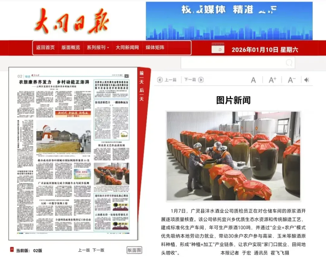 1月7日,广灵县沣水酒业公司质检员正在对仓储车间的原浆酒开展逐项质量核查。该公司依托宜兴乡优质生态水资源和传统酿造工艺,建成标准化生产车间,年可生产原酒100吨,并通过“企业+农户”模式优先吸纳本地劳动力就业,带动30余户农户参与高粱、玉米等酿酒原料种植,形成“种植+加工”产业链条,让农户实现“家门口就业、田间地头增收”。