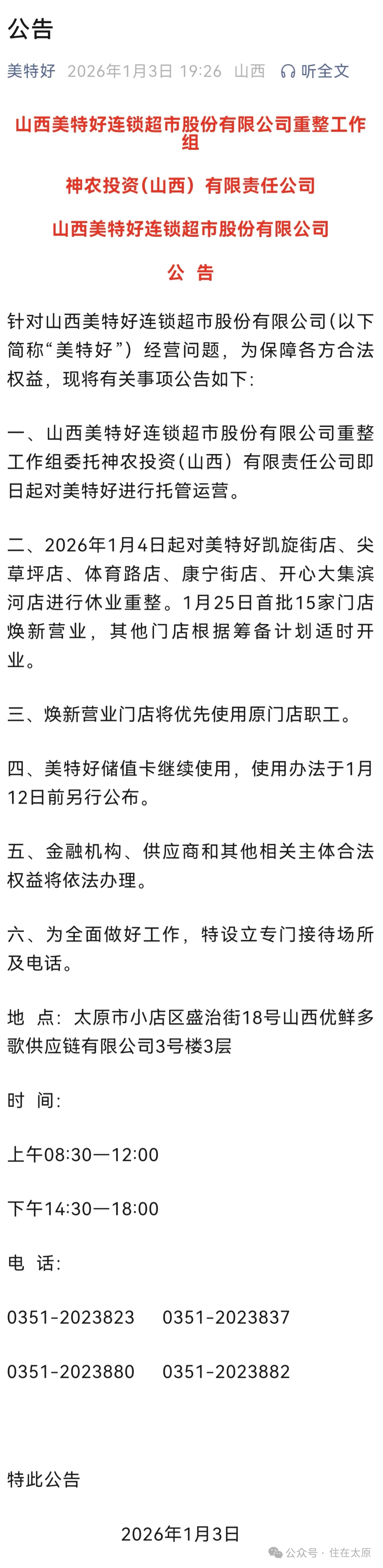 依托省属国企背景,提供稳定的信用背书,缓解预付卡挤兑与供应链信任危机;迅速恢复各方(消费者、供应商、员工)信心,稳定市场预期,保障重整期资金链稳定。依托神农科技集团的农业全产业链资源(如山西粮油集团、省储备粮管理等),能快速重构美特好的商品供应体系,尤其保障米面油、生鲜等民生商品供应,解决商品断供问题。神农科技集团的农业产品可借助美特好线下渠道拓宽销路,美特好则获得稳定供应,形成 “产—供—销” 闭环;同时优先录用原职工,保障就业稳定,维护社会民生。对接地方政府政策支持,在门店重整、项目申报等方面获得便利,能获得更多政策资源,助力长远转型;整合山西本地农业基地与全国核心供应商,建立直采通道,提升供应链韧性根据美特好发布的公告,神农投资的托管运营将分阶段推进:2026年1月4日起,凯旋街店、尖草坪店等5家门店率先进入休业重整;1月25日,首批15家焕新门店将恢复营业,其余门店根据筹备进度逐步开放。官方承诺储值卡可继续使用,具体使用细则预计在1月12日前公布,细则的合理性与便捷性直接影响消费者信任重建。此外,门店恢复营业后,商品(尤其是生鲜和日用品)的丰富度、价格和品质也将影响客户体验。