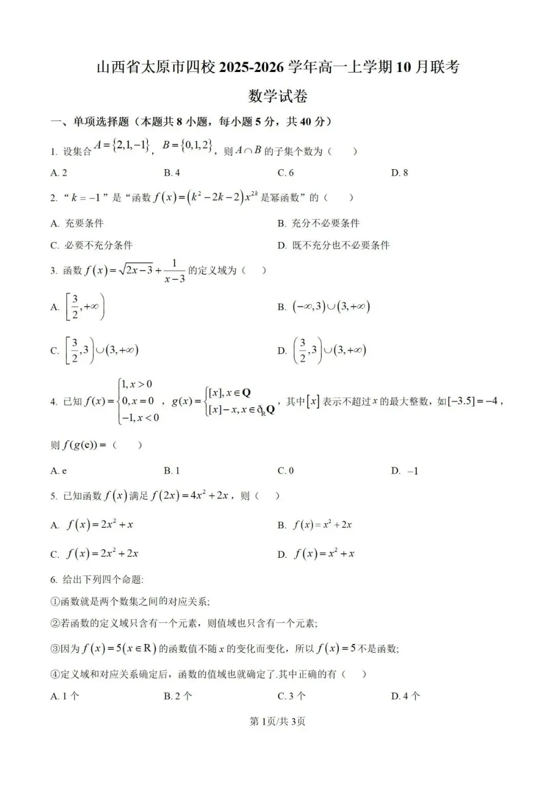 >山西省太原市四校2025-2026学年高一上学期10月联考数学试卷(原卷版)