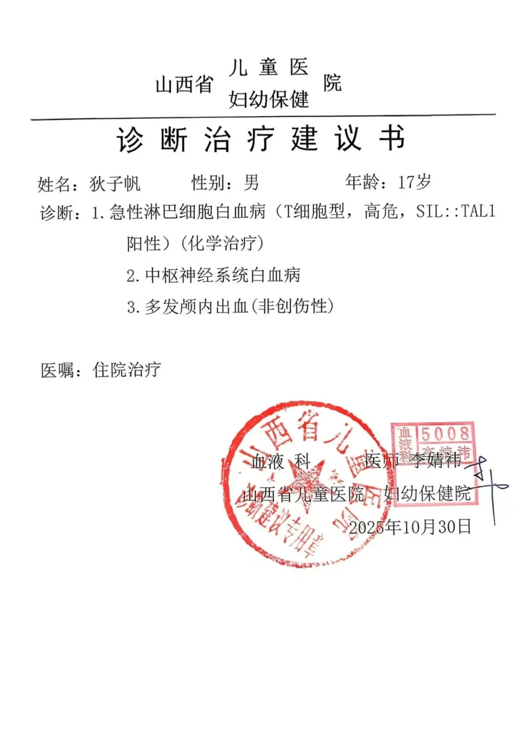 今天,山西老乡俱乐部 想带您认识一位来自咱们临汾市襄汾县新城镇狄家庄村的17岁少年——狄子帆。他本该在校园里备战高考,如今却躺在北京中国航天科工集团七三一医院的病床上,与急性淋巴细胞白血病进行着一场殊死搏斗。