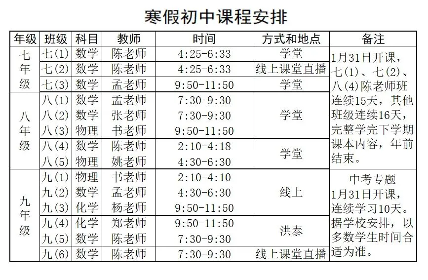 寒假初中课程安排