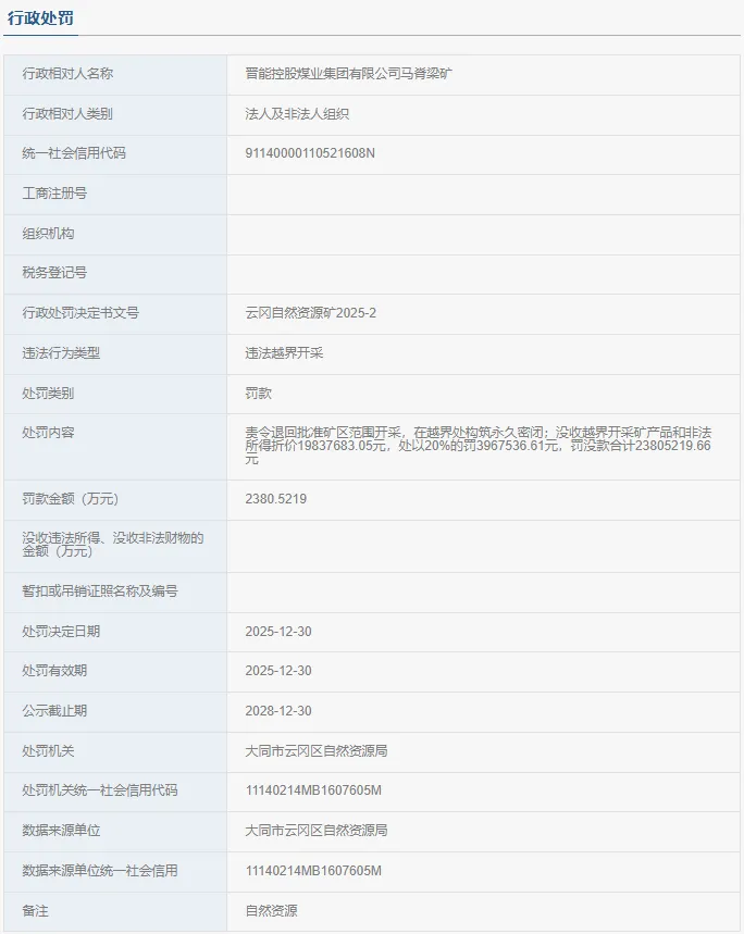 >罚款2380.5219万!大同又一煤矿越界开采被罚