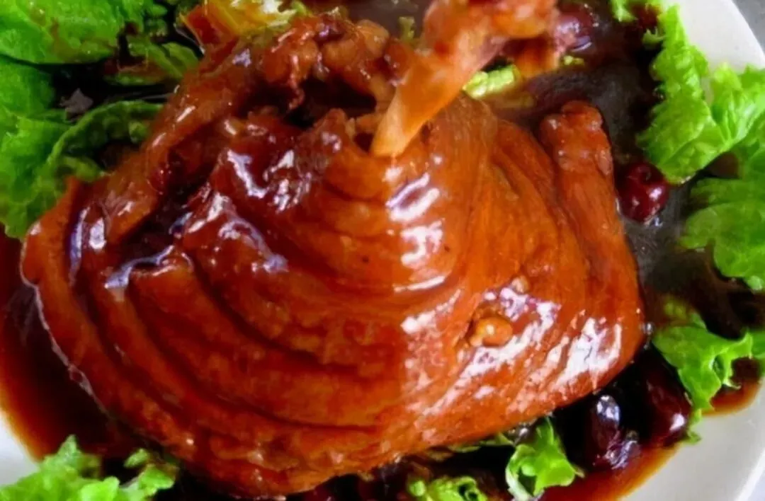 这菜压桌,红白喜事必上。猪肘子先炸后炖,皮子炸得起泡,炖到筷子一戳就透。勾芡收汁,酱色发亮,颤巍巍地端上来。动手得快,趁热夹一块,皮子黏嘴,胶质感拉丝,肉烂得不用嚼,舌头一抿就化。咸甜口,齁得慌,必须配米饭扒拉。一盘子四五十块,够6个人造。吃完嘴唇粘在一起,纸巾擦不干净,得拿热毛巾擦脸。本地馆子做得好的,锅里永远炖着一只。