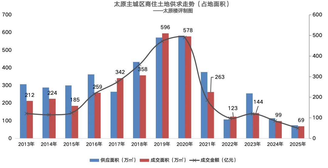2025年太原土地成交量仅刚过1000亩大关,成交占地面积69万方,成交金额仅有50亿元,这和2019年2020年高峰期,仅有十分之一!非市场化安置类占比较高!