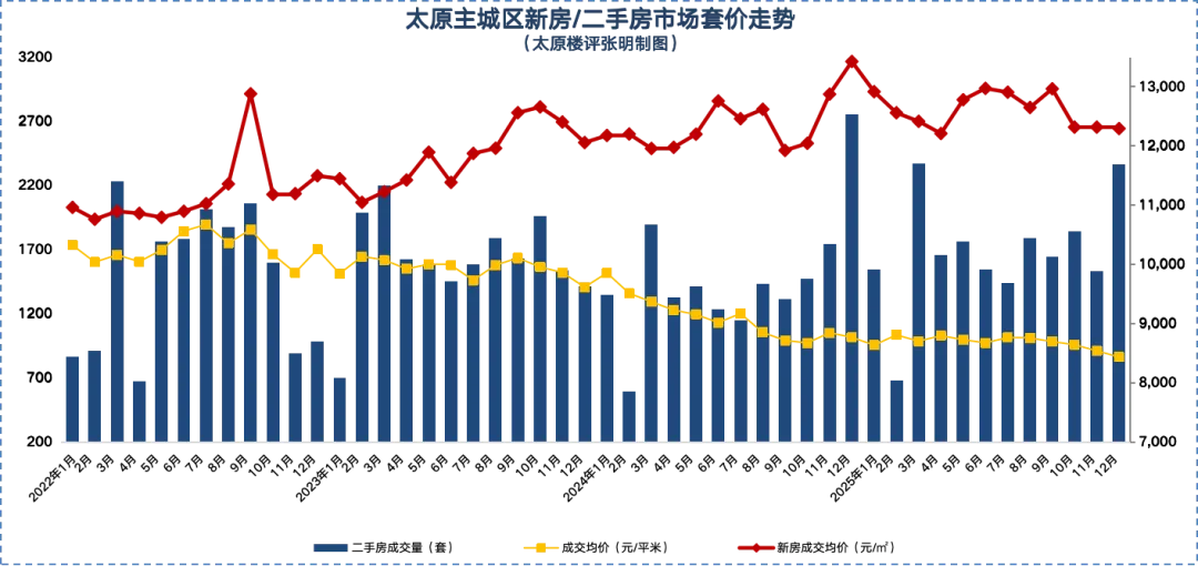 2025年太原挂牌二手房超过5万套,成交量月均2000套,成交价格逐步压低到9000元以内,综合看,太原新房供货不足二手房月度成交量有弯道超车的趋势。