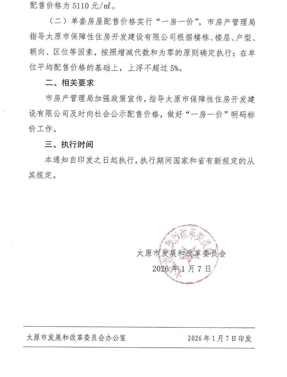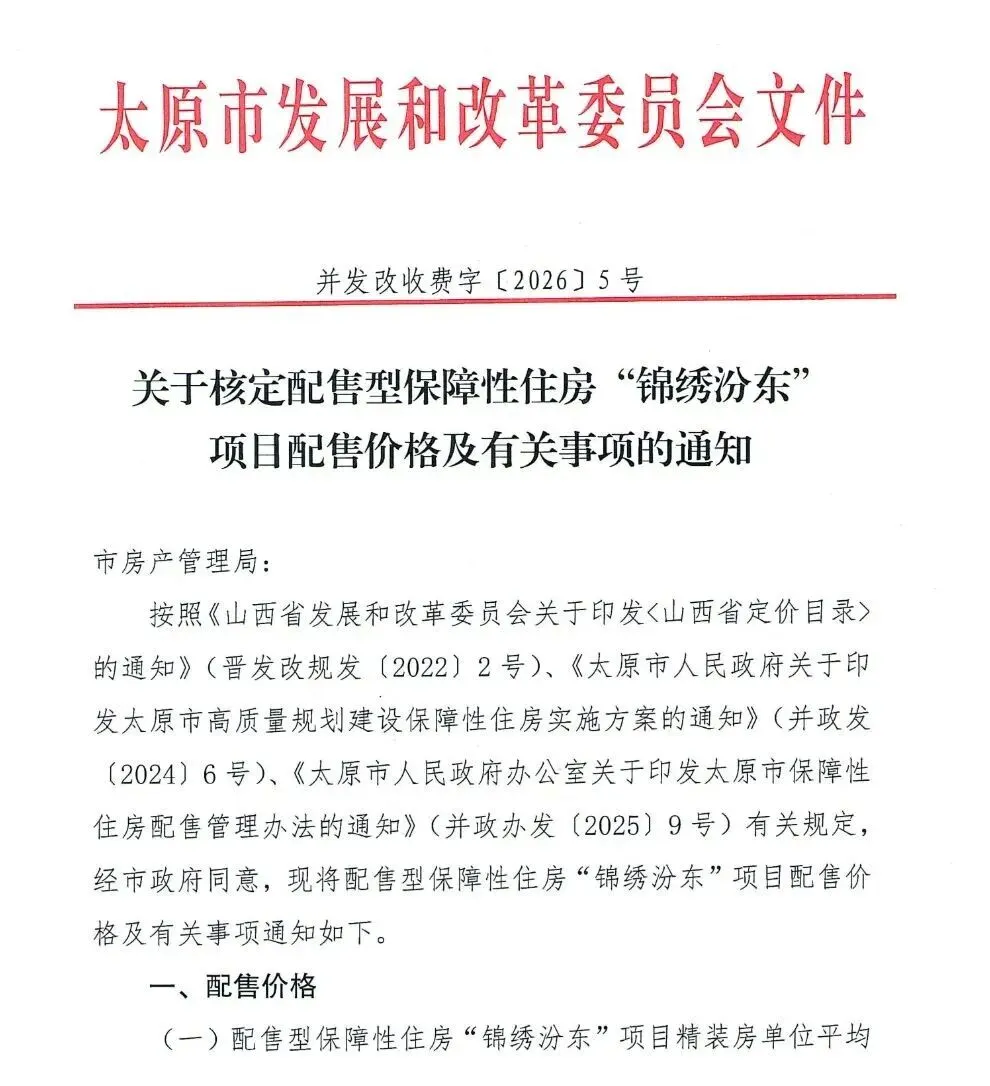 >太原市发改委:发布配售型保障性住房“锦绣汾东”项目配售价格(价格为5110元/m²)