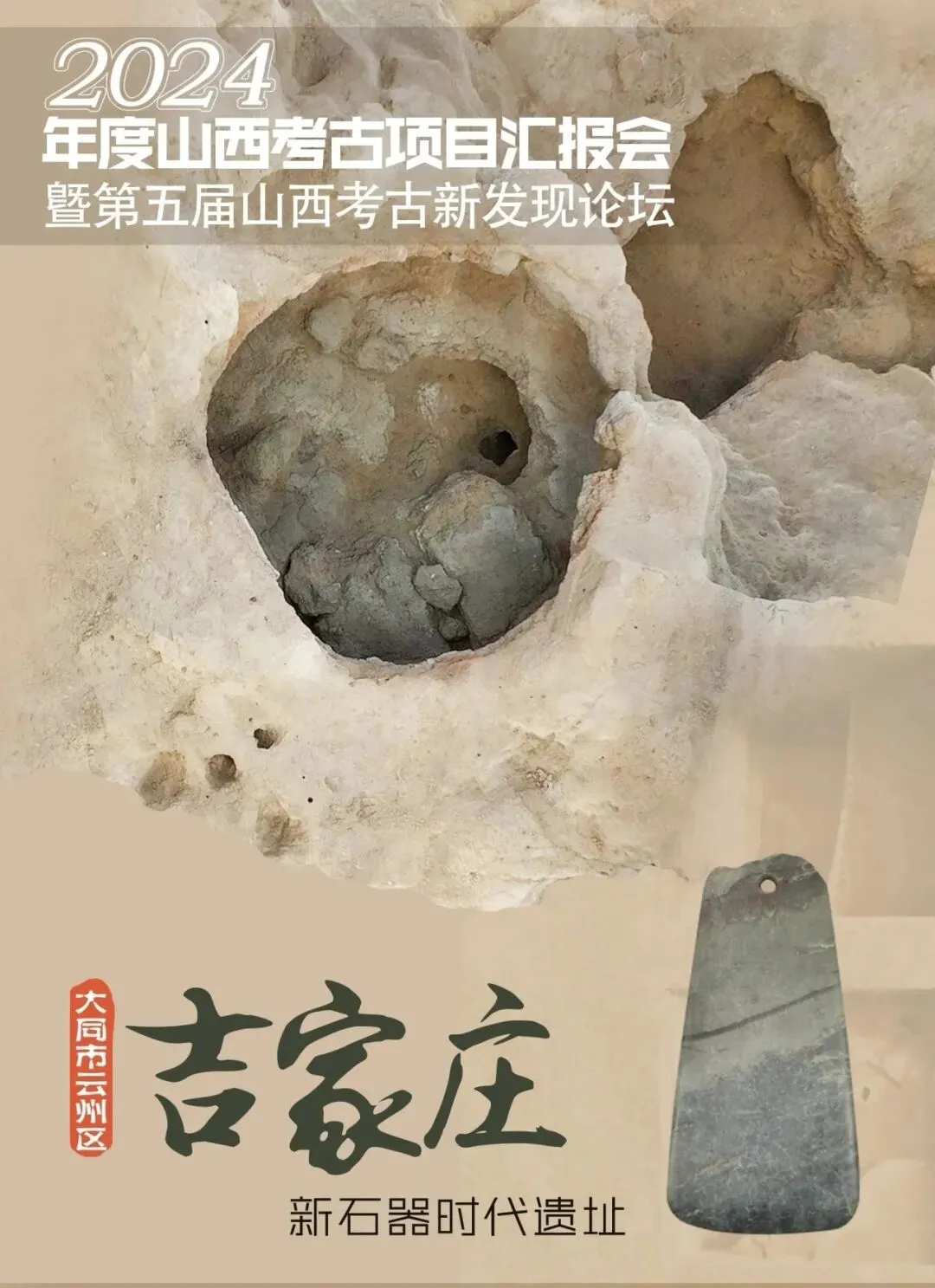 2、 新石器时期:①.吉家庄遗址,位于云州区吉家庄乡吉家庄约150米处的桑干河南岸台地上,面积约为100万平方米,,属于新石器时代仰韶晚期至龙山时期(约公元前3500—前2300年)的古代人类活动聚落,发现遗迹212处,包括灰坑192座、墓葬9座、房址6座、窑址2座和灶址3座;出土以石制品、骨(蚌)制品为主小件文物并伴有少量的陶器和玉器等珍贵