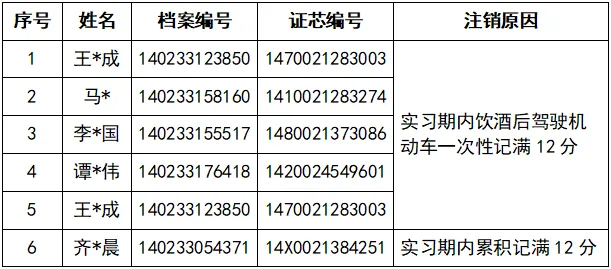 以下6名驾驶员在实习期内、实习期届满后处理实习期间发生的违法行为记满12分。现公示驾驶员信息,请及时前往车管所核实信息并注销驾驶证。机动车驾驶人未在规定期限(三十日)内申请注销驾驶证的,公安交通管理综合应用平台系统将自动注销其驾驶证,并通过邮政快递方式向机动车驾驶人送达《注销实习准驾车型决定书》。