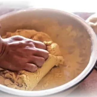 蒸好的糕倒进盆里,搋糕的人得快速沾水反复搋击挤压,每搋一下沾一次水,把糕揉成密实筋道的整体。接着双手掀起糕翻过来摔在盆中,在光滑的糕面上按个小洞,倒入少许胡麻油,用手指蘸着油把糕面抹匀,糕面上立马冒出细密的黄油泡泡,一块筋道金黄的黄糕就做好了。