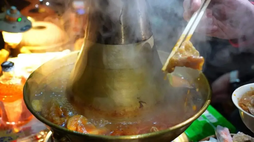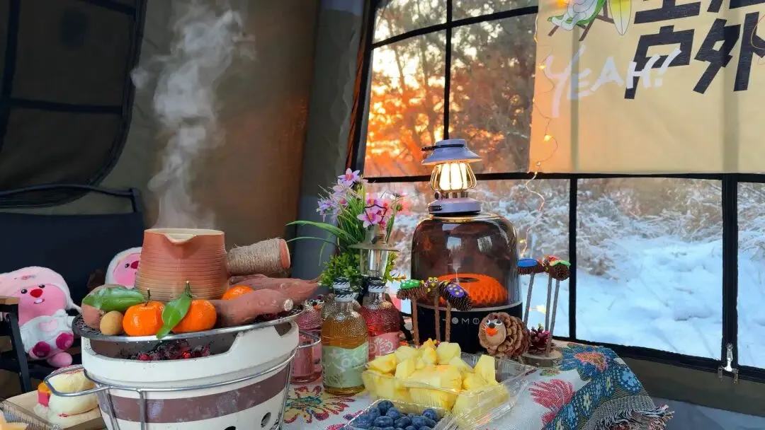 待到午后时光渐深,夕阳西下时,便是露营的高光时刻。落日的霞光穿透松枝,灰褐色的火山岩被镀上一层暖金。此时钻进营地的暖帐,最动人的莫过于那口沸腾的铜火锅,炭火正旺,鲜红的汤底咕嘟冒泡,鲜嫩的羊肉卷、脆嫩的时蔬在锅中翻滚,热气裹挟着肉香漫出帐篷,与帐外的寒气形成奇妙的碰撞。围坐炉边,煮茶的陶壶正冒着白烟,烤得焦香的橘子、软糯的红薯在炭火边滋滋作响,这大概就是冬日里最治愈的烟火人间。
