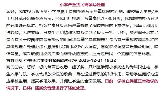 >长治有人投诉某小学严重扰民!官方回复!