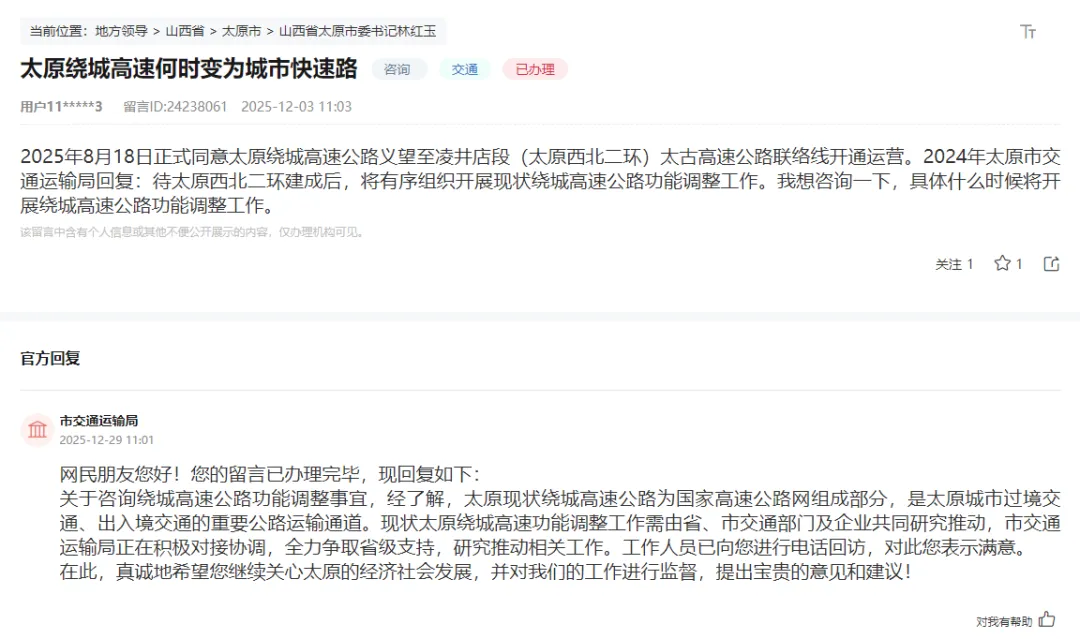 那么太原绕城高速何时能够完全调整为城市快速路?近日有网友在领导留言板提到了相关问题并得到了官方回复。