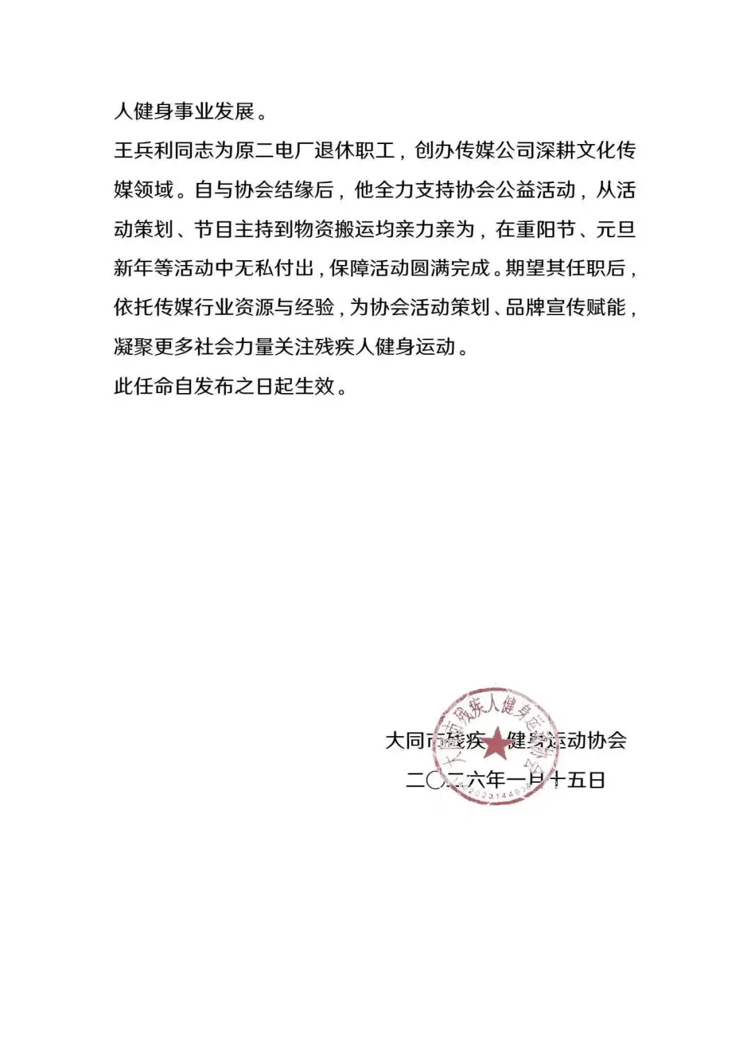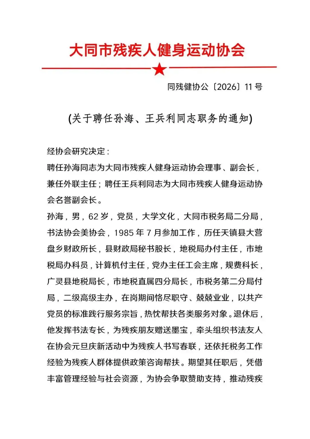 大同市残疾人健身运动协会聘任公告