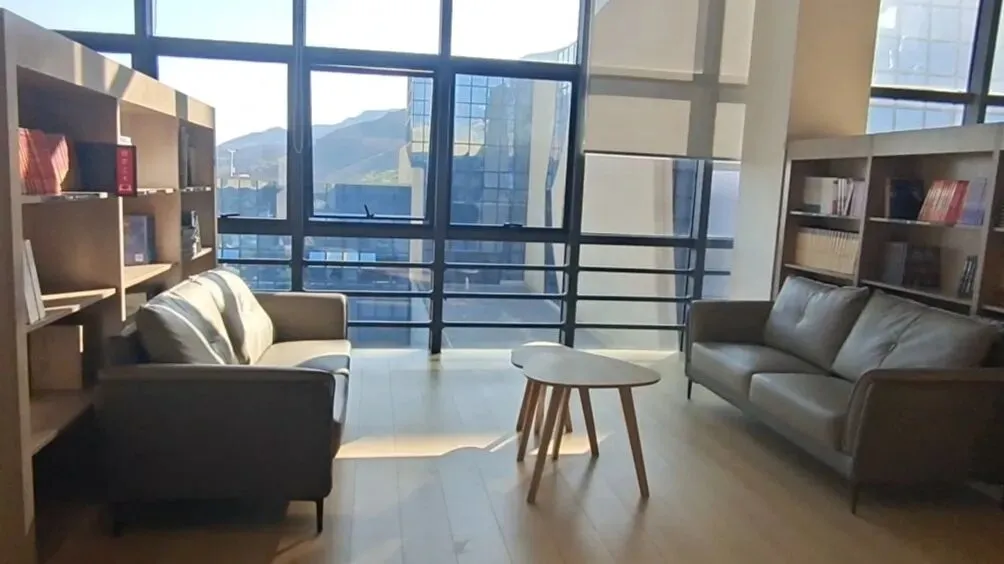 建筑外立面以浅米色石材搭配蓝色玻璃幕墙,利落的线条里揉进了长城墙体的肌理感,现代设计和山水底色撞在一起,一点不违和。