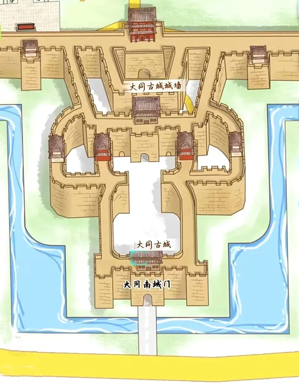大同古城有“四关四小城”。大同的“小城”(以南小城为代表)是明代九边重镇特有的独立外围关城,属“凤凰城”(凤头部分)格局的重要部分,兼具军事防御与商贸居住功能;城池层级体现为:“外围关城(即小城)—主城瓮城—主城门”的层级递进关系,从南向北进城需经南小城永和门→南关通道→永泰门瓮城外门→瓮城门→主城门永泰门;目前小城仅核心节点复建为闭合堡垒形态,远未恢复到明代的实际规模。