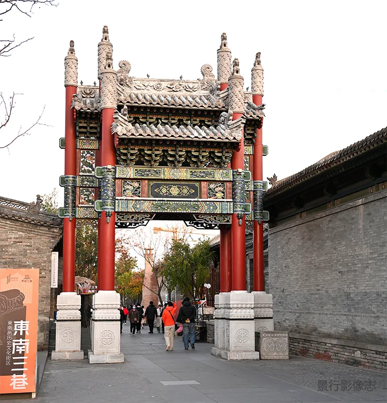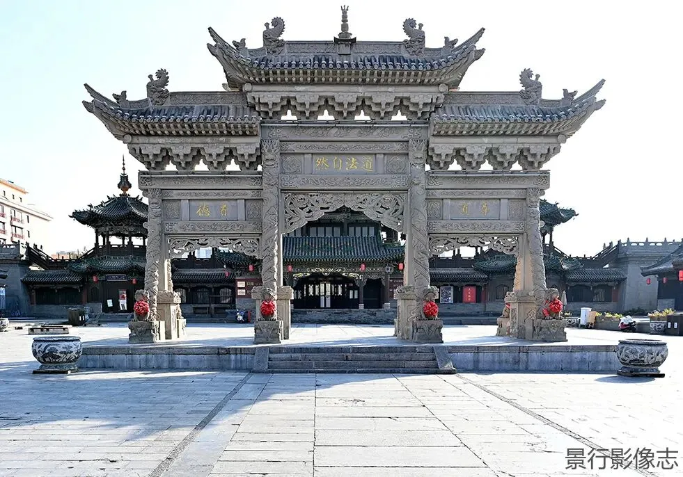纯阳宫广场,包括戏台、四柱三枋石牌坊、玄天阁、长生阁、八卦楼、隅仙台,以及东西厢房等,均为现代仿古建筑,2013年完工。主要功能:举办古城大型传统节庆、戏曲展演、非遗展示等活动,是市民与游客的文化互动空间。