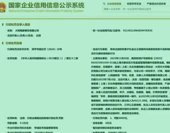 近日,大同某餐饮因使用“人民咖啡”字样被当地部门罚款3000元。理由为当事人涉嫌使用造成不良影响的商标的违法行为。