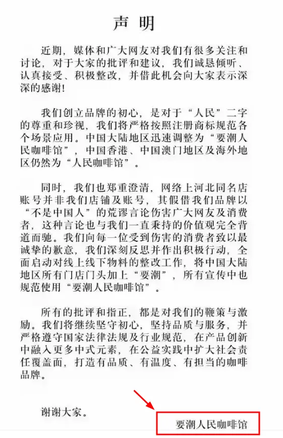 据了解,咖啡馆的上级总公司为要潮上海文化传播公司,本来品牌名是“要潮人民咖啡”,并曾五次申请人民咖啡的商标均被驳回。而在2025年11月,去了“要潮”的“人民咖啡”一度成为网红。