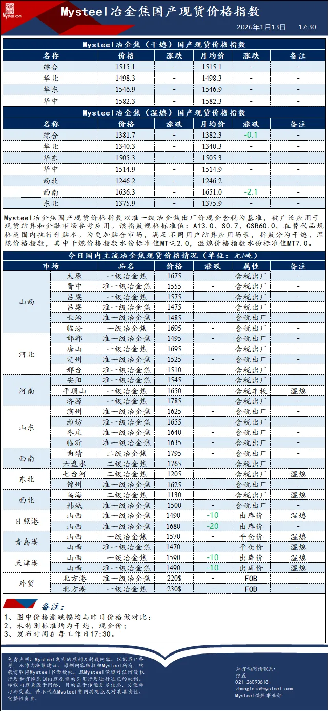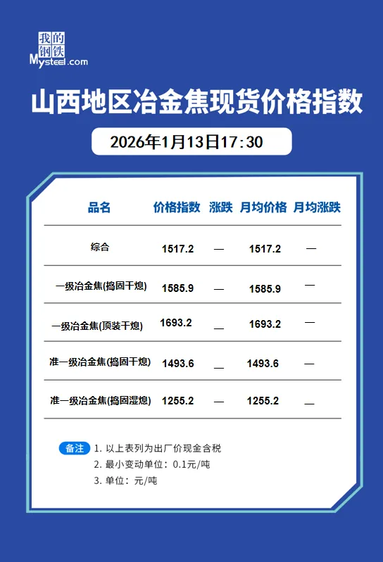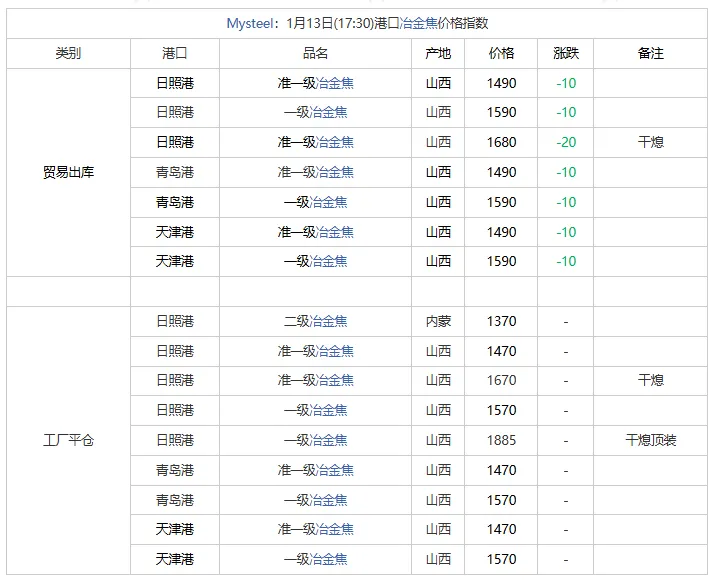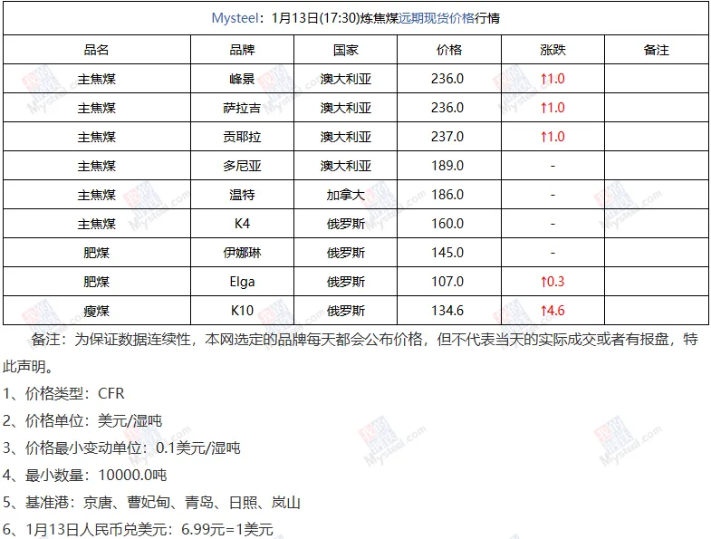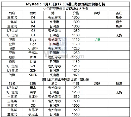 【港口焦炭】13日港口焦炭现货市场偏弱运行。内贸现货市场交投氛围一般,受期货盘面价格震荡影响现货整体询报盘稳中有降运行。外贸需求表现一般,受产地情绪影响而报盘整体持稳 。后续走势需关注下游钢厂利润水平、焦煤成本端变化以及期货盘面情绪等情况对港口焦炭的影响。【进口蒙煤】29日蒙古国进口炼焦煤市场偏弱运行。期货盘面下跌,口岸贸易企业报价相对坚挺,然下游市场询盘问价偏低,市场成交氛围冷清,甘其毛都口岸库存持续累库中,现已超385万吨,焦炭四轮提降今日开启,终端焦钢企业暂未有明显补库动作,煤焦市场走势有待观望。现甘其毛都口岸:蒙5#原煤955,蒙5#精煤1107,蒙4#原煤900,蒙3#精煤1050,1/3焦原煤710;河北唐山:蒙5#精煤1320;均为对应提货地结算含税现金价。后续重点关注四季度口岸过货量目标完成情况、国内产地煤矿“查超产”政策影响和钢厂铁水产量对蒙煤贸易的影响。(单位:元/吨)【远期炼焦煤】【产地炼焦煤】13日长治沁源市场炼焦煤线上竞拍价格上涨。低硫瘦主焦煤A8、S0.5、G65起拍1450元/吨,成交均价1579元/吨,成交3万吨,上期5日涨100元/吨,以上均为出厂价现金含税。【进口炼焦煤】13日蒙古国进口炼焦煤市场震荡波动运行。期货盘面上午保持小幅波动,口岸贸易企业报价暂稳,市场成交明显放量,下午盘面跌破1200点后,市场接货意愿有所降低,目前蒙煤市场价格受期货盘面走势影响较大,部分下游企业拿货仍处观望态度,临近冬储补库周期,市场对后续煤价走势仍有一定稳中看涨预期。现甘其毛都口岸:蒙5#原煤1068,蒙5#精煤1197,蒙4#原煤990,蒙3#精煤1100,1/3焦原煤728;河北唐山:蒙5#精煤1305;均为对应提货地结算含税现金价。后续重点关注口岸监管区库存情况、国内产地煤矿复产情况和国内铁水产量波动对贸易的影响。(单位:元/吨)【远期炼焦煤】13日进口炼焦煤远期市场偏强运行。澳大利亚远期海外炼焦煤一线主焦CFR236.0美金/吨,日环比上涨1美金。澳大利亚远期炼焦煤市场受天气影响,供应紧张预期仍存,市场报盘价格维持较高水平,远期市场支撑偏强。俄罗斯远期市场偏强运行,Low Vol Coking coal type A(K10)截标一船(原煤),价格有所上涨。【港口炼焦煤】13日海运炼焦煤港口现货暂稳运行。港口俄1/3焦煤到港,煤种库存分化,骨架煤流通性一般;终端市场按需采购;盘面快速回调,期现商报价相对坚挺,整体成交效率有待修复。【远期喷吹煤】13日Mysteel俄罗斯Low Vol PCI 价格指数CFR中国121美元/吨,较上期涨1美元/吨。近日国内喷吹煤竞拍价格回涨,在焦煤强势的带动下,喷吹煤价格出现回涨,市场情绪回暖,下游采购成交价格有所回涨,预计短期继续偏强运行。【无烟煤】13日主要市场无烟煤价格稳中偏强运行。受末煤上涨带动,市场活跃度提升,坑口拉运情况较前期变好。加之天气降温明显,部分民用用户入场,带动中块价格上涨,线上竞拍溢价明显。煤化工企业一月下旬及月底部分企业恢复生产,届时需求或有增加,目前仍以刚需采购为主。【烧结煤】13日主要市场烧结煤价格行情,市场竞拍成交积极,涨幅较大。地方矿库存紧张,日产低位上涨25-30元/吨、主流大矿价格稳定,日产恢复节前正常水平,库存同步消耗。下游高炉铁水产量逐步回升,刚性需求带动,动力煤价格稳定,短期中间上补库带来一定利好。【钢坯】13日唐山迁安松汀钢铁普方坯资源稳,执行2980含税出厂。(元/吨)。【铁矿】13日日照港进口铁矿(9:15)主流品种市场价格下跌2。早间贸易商报价积极性一般,询盘偏弱。现60.8%PB粉822跌2,61.6%PB块888跌2,卡粉918跌2,超特粉703跌2,58.5%SP10粉763跌2,48.5%榕海烘干镍铁矿400平。(对比前一工作日晚间价格;单位:元/湿吨)【建材】13日上海建筑钢材价格午后部分下跌10,现螺纹3170-3300,中新钢铁抗震3190,敬业抗震3220,盘螺3410-3530,高线亚新3390。(元/吨)【热卷】13日午后杭州热卷价格跌10,1500卷3310左右,薄卷3380,低合金3430。(单位:元/吨)▍13日国内市场炼焦煤价格稳中偏强。供应方面,主产地煤矿多数保持正常生产节奏,市场交投气氛活跃,坑口签单量明显回升,部分煤种价格小幅上调。线上竞拍价格普遍上涨,线上竞拍成交价格普遍上行,其中长治沁源低硫瘦主焦煤均价1579元/吨,较上期上涨100元/吨;吕梁地区低硫主焦煤成交价1420元/吨,上涨14元/吨;高硫瘦煤成交均价1163元/吨,上涨113元/吨。需求方面,当前钢厂仍处复产周期,同时正值原料补库阶段,对炼焦煤的需求逐步释放,对煤价形成支撑。综合来看,预计短期炼焦煤价格重心将稳步上移。▍13日焦炭价格暂稳运行,原料端,焦煤价格近期快速上涨,涨幅12-104元/吨,市场采购积极,成交订单量大;焦企方面,焦化厂生产积极性一般,吨焦利润亏损加剧,下游采购积极性一般。原料方面,下游多按需采购,煤矿生产积极性正常水平。 短期来看,焦炭市场暂稳运行为主,后期需持续关注焦煤走势、钢材价格走势与钢厂盈利状况及期货盘面走势对焦炭价格的影响。动力煤资讯