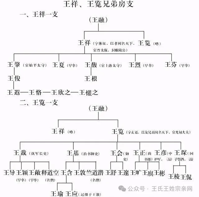 王祥、王览两兄弟是琅邪王氏的代表人物。但王祥的后代多于史不显。而王览子孙,在东晋至隋唐五代时期,都世居高官显爵。而显达的是王导、王舒、王旷、王廙和王彬这五大房支。